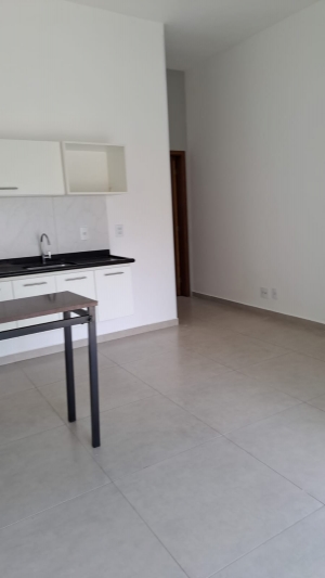 01 DORMITÓRIO, SALA, COM COZINHA CONJUGADA COM GABINETE, BANHEIRO COM BOX BLINDEX, LAVANDERIA COBERTA E UMA